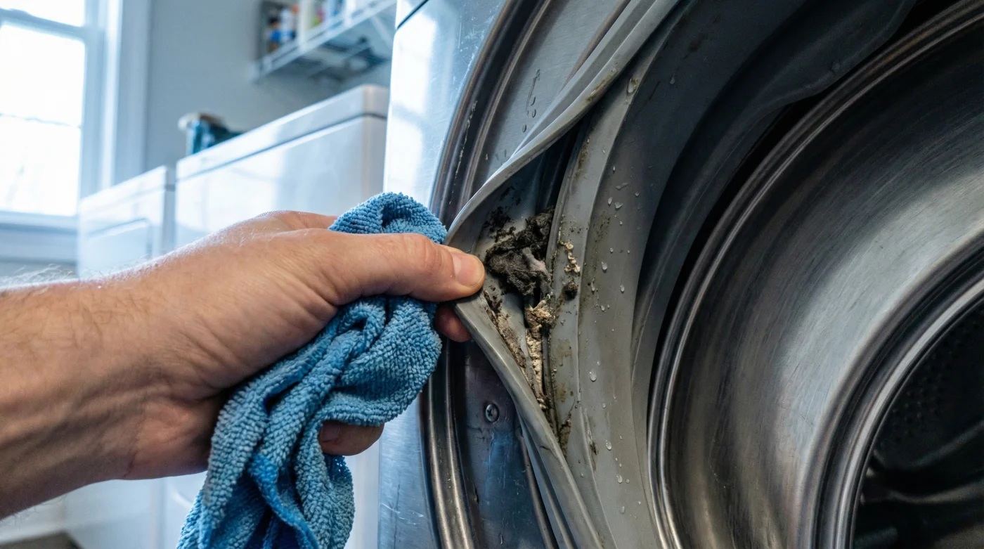 - Waschmaschinen-Dichtung pflegen: Wische nach jedem einzelnen Waschgang das trübe Restwasser aus der dicken Gummilippe am Eingang. Lass das Bullauge danach unbedingt mindestens einen Spaltbreit offen stehen, damit die Restfeuchte restlos entweichen kann.